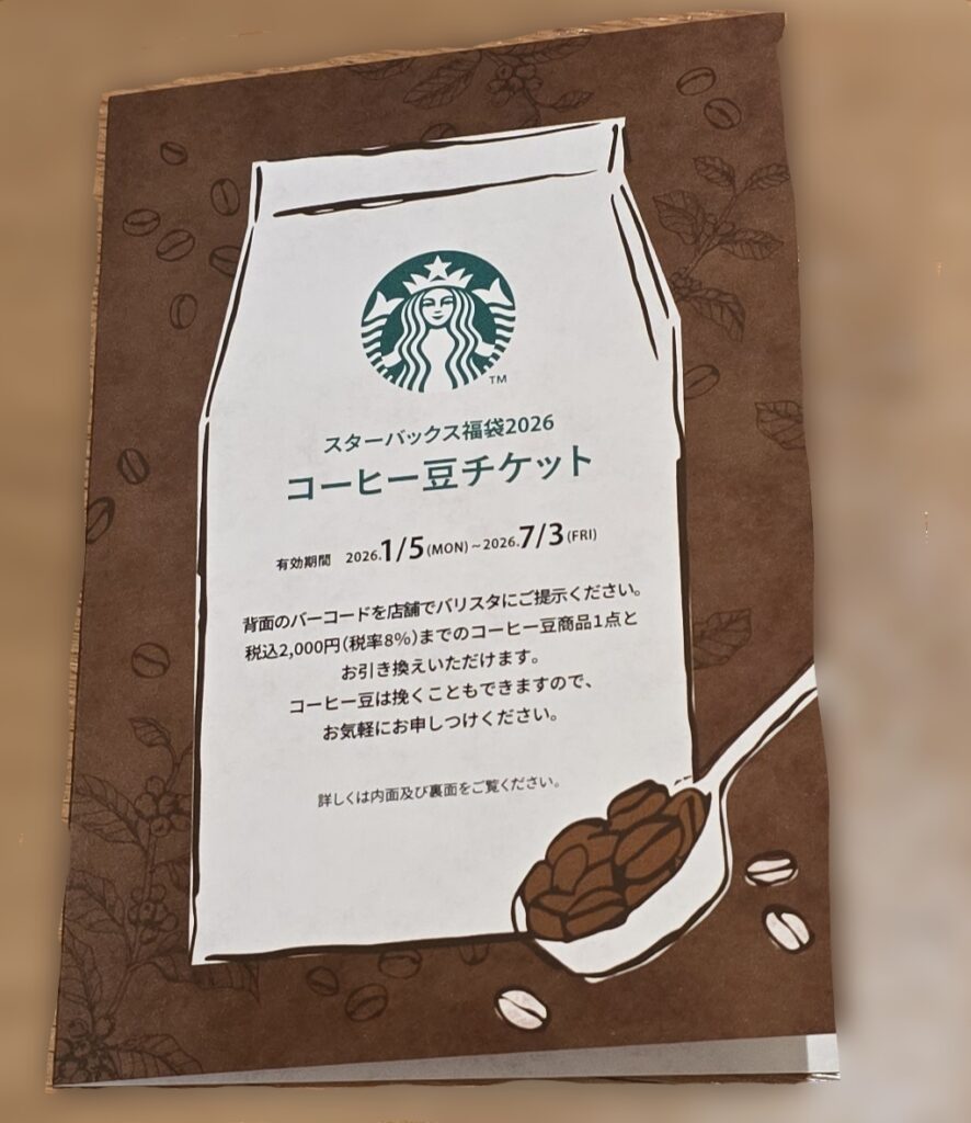 コーヒー豆のチケットも入っていました。これは、お店に行ってコーヒー豆(税込2000円まで)と引き換えてもらえるものです。豆は挽いてもらうこともできるようなので助かりますね。