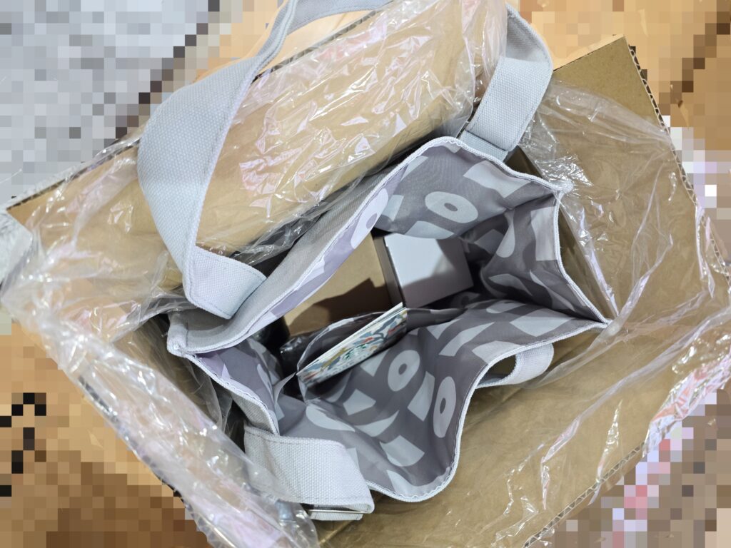 福袋は郵送で届きます。段ボールにこんなかんじで入っており、段ボールの中ではしっかりと袋に入っていました。