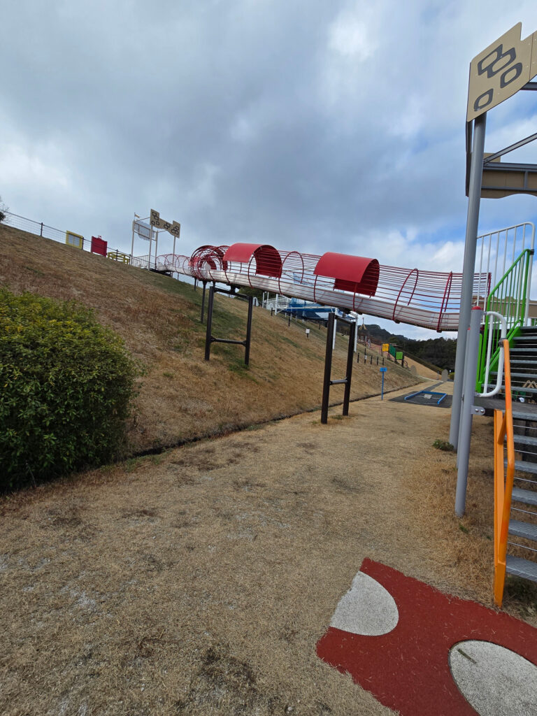 大野城いこいの森中央公園で最も注目されるアトラクションのひとつが、全長90メートルもの迫力満点のローラースライダーです。子どもから大人まで楽しめるこのスライダーは、公園の高台を活かして設計されており、滑り降りる途中に広がる景色も魅力のひとつです。