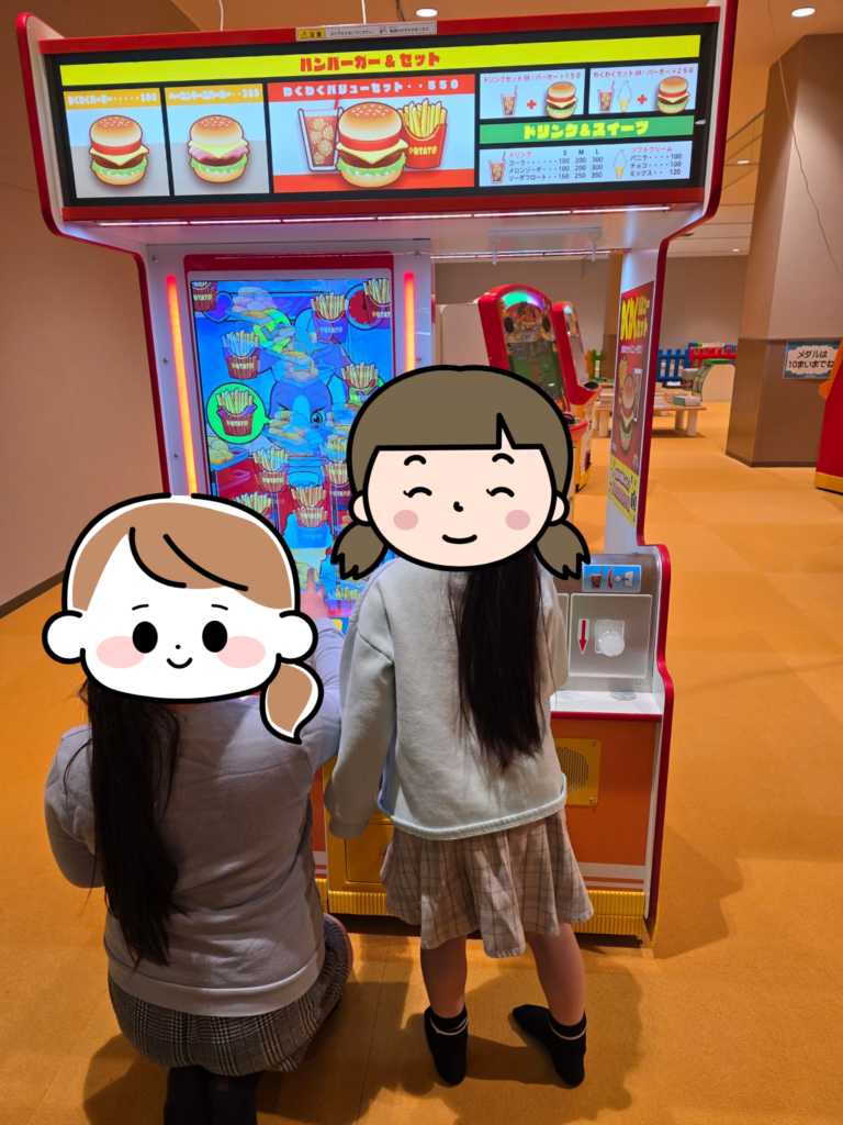ゲームコーナーにはいくつかのゲームが置いてあり、これはその1つです。お客さんにハンバーガーなどの食べ物を渡していくゲームでした。そのほか太鼓の達人、メダルゲームなどもありましたよ。メダルゲームは帰る直前に遊んだのですが、普段あまりしないゲームだったのでかなり楽しんでいました。
