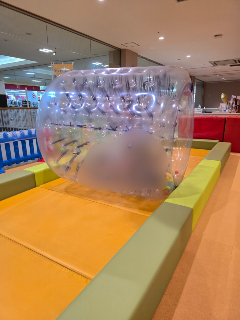 サイバーホイールは、フワフワの円形の中に入り転がして遊ぶ遊具です。中に入って、くるくる回るのが楽しいようでした。
