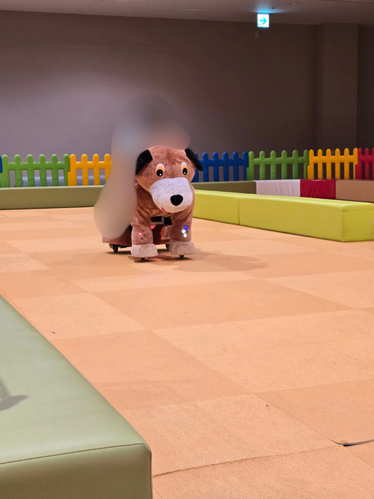 自動で動く、犬のフワフワな乗り物です。1人何分と時間が決まっているので、ついているストップウォッチではかり、時間がきたら交代するようになっていました。動くスピードはかなりゆっくりなので、3歳程度の子どもでも乗ることができるのではないかなと感じました。